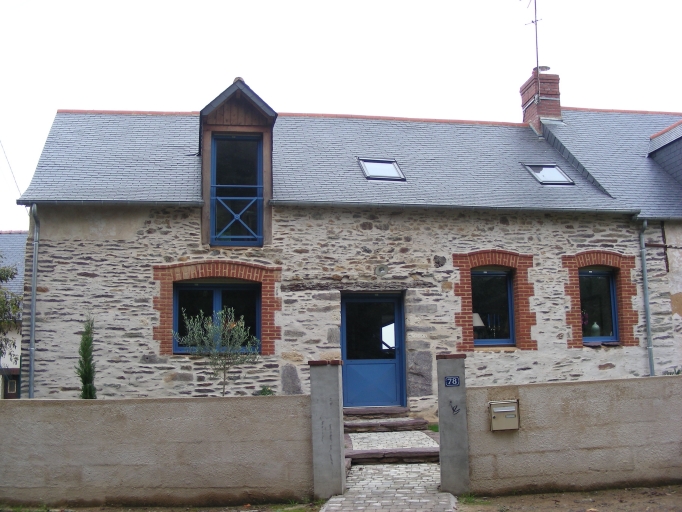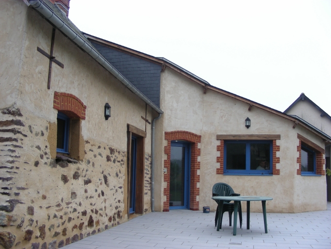 La majorité de la construction est réalisée en maçonnerie de moellon de schiste ; seules certaines parties supérieures, notamment à l'est, sont réalisées en bauge. Les toitures à longs pans sont couvertes d'ardoise et deux portes hautes pendantes donnent accès au comble à surcroît. Les encadrements de baies sont mixtes : brique plutôt à l'ouest et carrées bois à l'est.
