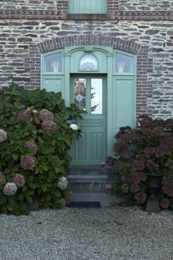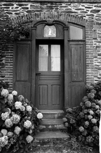 La maçonnerie de cette maison est principalement composée de moellon de schiste pourpre ; le toit à croupes est couvert d'ardoise. Le décor de brique est abondant : encadrements de baies, souches de cheminées, bandeaux, chaînages d'angles, corniche, lucarne. La façade nord est rythmée par trois travées, formées par les baies de la façade. La travée centrale se termine par une lucarne. La porte d'entrée est entourée et surmontée de boiseries. La partie supérieure centrale des boiseries porte la date de construction de la maison et les initiales du commanditaire présumé. Ces mêmes initiales se retrouvent sur les ancres des souches de cheminées de l'est. Il existe des appentis latéraux à l'est et à l'ouest de la construction ; ils sont construits en terre et recouverts d'un enduit.
