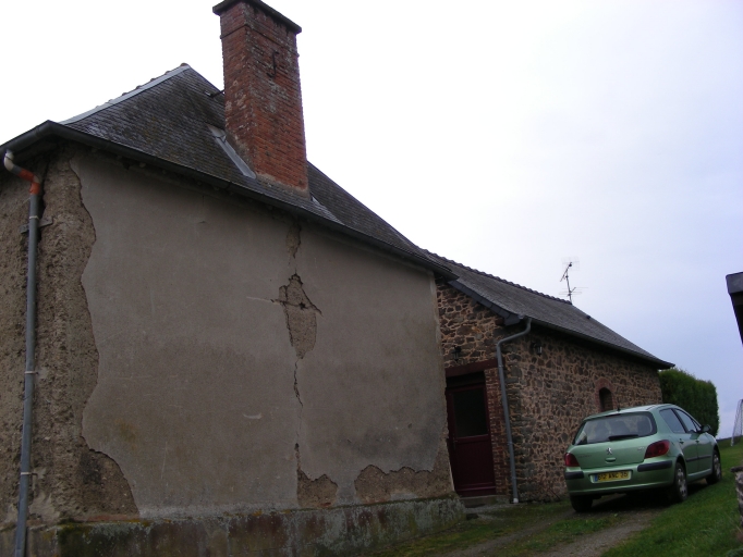Le logis de cette ancienne ferme est construit en bauge sur un solin composé de moellon de schiste. Le toit à croupes est couvert d'ardoise. La partie centrale du bâtiment forme un fronton-pignon. Les encadrements des baies ainsi que les souches de cheminées de ce logis sont réalisés en brique. Un ancien fournil se trouve au nord, et des anciennes porcheries s'élèvent au nord-ouest. Ces deux bâtiments sont construits en maçonnerie de moellon de schiste et couverts d'ardoise. Enfin, au sud du logis, il existe une ancienne étable, construite en moellon de schiste pourpre et couverte d'ardoise. Les encadrements de baies sont réalisés en brique et les linteaux en ciment.
