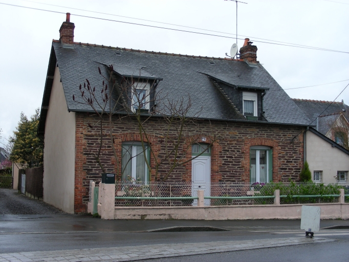Maison construite en moellon de schiste, le pignon est enduit. Les encadrements des ouvertures sont en brique avec linteau cintré, le chaînage des angles ainsi que le bandeau horizontal qui rythme la façade sont également en brique.