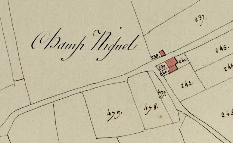 Sur le cadastre napoléonien de 1812, cette ancienne ferme est composée d'un alignement de deux logis. La partie accolée au corps principal fut ajoutée après cette date car elle ne figure pas sur le cadastre ancien, ainsi que la dépendance en face du logis. Il s'agissait de deux logis élémentaires composés d'une seule pièce à feu pour vivre. Cela correspond en façade à une porte en plein cintre et une fenêtre pour chaque logis, et une partie de dépendance. La construction remonte sans doute au 17e siècle, comme l'indiquent les portes en plein cintre et la fenêtre avec grille, même si certaines ouvertures en calcaire ont été refaites par la suite.