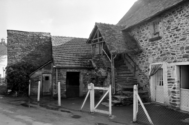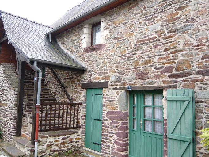 Cet ensemble se compose de deux maisons mitoyennes qui donnent d'une part sur la rue Croix Maréchal, d'autre part sur la place située au pied du pont. La maçonnerie est en moellon de schiste violet en petit appareil irrégulier, les toitures sont en ardoise. L'élévation comprend deux niveaux, une rez-de-chaussée et un étage. Les ouvertures ont été remaniées voire bouchées, mais il subsiste encore certains encadrements en gros appareil de schiste et de granite chanfreinés, des linteaux de bois et des appuis saillants en schiste sculpté. La première habitation est accessible par la rue. Un escalier extérieur d'une volée avec tournant à gauche couvert en partie supérieure d'un toit à deux versants permet d'accéder à l'étage. Les ouvertures de la seconde habitation se situent sur le mur pignon qui donne sur la place. L'encadrement d'une fenêtre située au premier étage de la façade postérieure (sud-est) présente également un cordon sculpté sur son appui et les trous d'une grille ancienne.