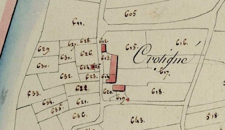La pente et le coyau du toit, les encadrements en schiste monolithique chanfreiné, la grille en fer forgé de la fenêtre, la souche de cheminée et le vaisselier sont des éléments anciens qui permettent de faire remonter cette construction au 17e siècle. L'ensemble de ces bâtiments est présent sur le cadastre de 1812. Les ouvertures ont été très remaniées mais la petite fenêtre grillée, de facture particulièrement soignée, et la souche de cheminée en schiste sont tout à fait remarquables. L'ensemble est peu lisible aujourd'hui. On peut cependant supposer qu'il s'agissait soit de deux logis étables juxtaposés, soit d'une maison longue.