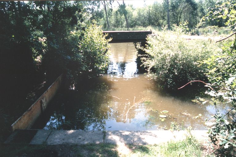 Barrage destiné à détourner une partie du cours de l'Oust afin de créer un canal latéral qui dessert la ville de Redon. Déversoir rectiligne, situé sous le pont. Embarcadère : dalles de schiste ; bittes d'amarrage. Ponceau de halage à 100 m en aval de la Maclaye ; ponceau de halage au sud-est du Bougro. Borne kilométrique 102 et rare borne intermédiaire des 500 m au sortir de la courbe ; sept bittes d'amarrage dans la courbe en amont de la Potinais (M. -D. Menant).