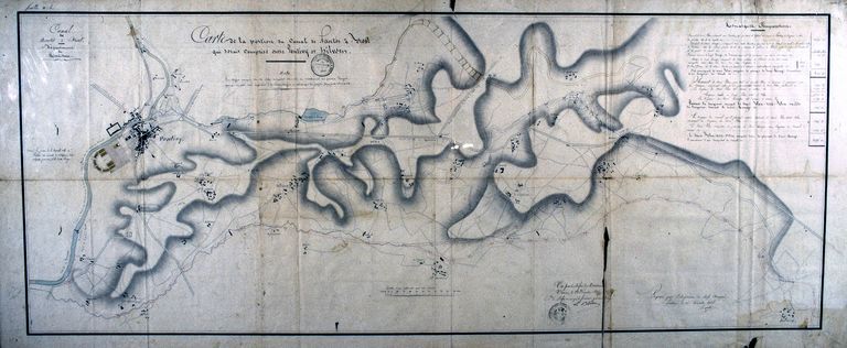 Plan du canal de Nantes à Brest et de ses abords dans la traversée du Finistère dressé par l'ingénieur de l'arrondissement de Châteaulin. Plan, par Tourbrèze, ingénieur ordinaire des Ponts et Chaussées, 28 novembre 1842. Papier, encre, aquarelle, 243,6x46 ; échelle : 1 : 20000. (Direction départementale de l'Equipement du Morbihan, subdivision de Pontivy, archives).