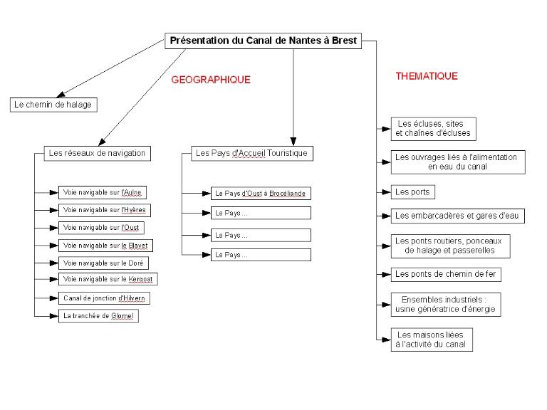 Les différentes notices sont classées du général au particulier, depuis le dossier de « Présentation du Canal de Nantes à Brest » jusqu'à l'ouvrage d'art, en passant par les notices des voies navigables sur les différentes rivières, les canaux de jonction, les éventuelles structures portuaires ou les ouvrages d'art associés appartenant aux réseaux adjacents. Elles sont accessibles indifféremment de façon géographique ou thématique - comme l'indique le schéma ci-dessous - au moyen des liens hypertextes des rubriques Voir ou Voir aussi, en bas de page des notices d'oeuvres recensées.