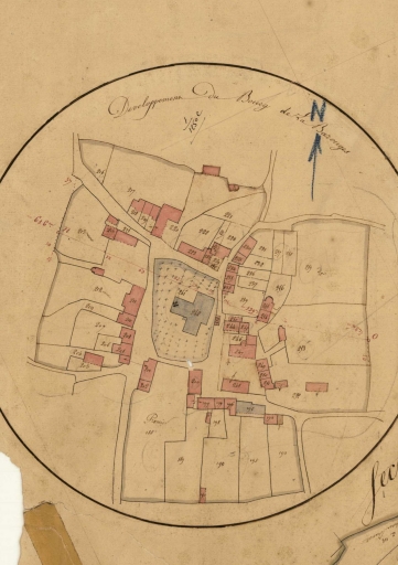 La Bazouge-du-Désert. Section F dite du bourg, en deux feuilles, 1ère feuille, du n°1 au n°364. Par Mr Declaye géomètre 1ère classe, [1834], échelle 1/2500 e. (A.D. Ille-et-Vilaine).