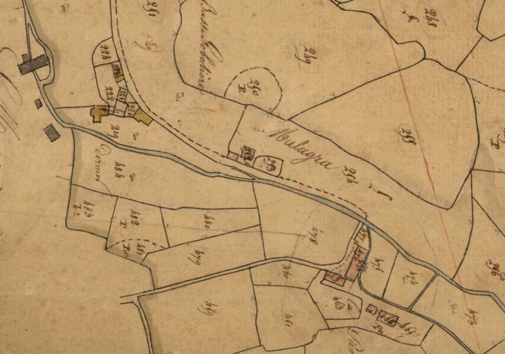 La Bazouge-du-Désert. Section B dite du Pont Dom Guérin, en deux feuilles, 1ère feuille, du n°1 au n°484, par Delacour, géomètre. [1834], échelle 1/2500 e. (A.D. Ille-et-Vilaine).