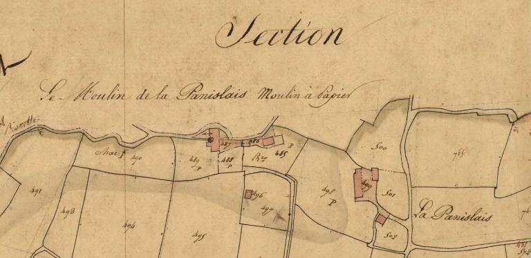 Le moulin de la Panislais est construit, en 1693, par les frères et sœur Jean, Olivier et Thomasse Fouillard, suite à la cession à fieffe du lieu-dit la Panislaye. En 1735, c'est Jean Blin (ou Belin) Maisonneuve, fils de Thomasse Fouillard (veuve Belin) qui en est le propriétaire selon le registre du dixième. En 1751, le même Jean Blin déclare posséder une partie du moulin de la Panislais. Il l'afferme à Jean Blin (son fils ?) et à Louis Roussin. Lors de l'enquête de 1776, la production annuelle est de 900 rames de papier, l'équipement du moulin est de trois piles à maillets. Le papetier exploitant en est François Laisné. Le moulin est exploité pendant toute la première moitié du XIXème siècle par Joseph Roussin et son épouse Thérèse Depasse. L'activité papetière s'arrête avant 1836.