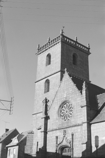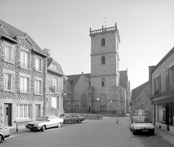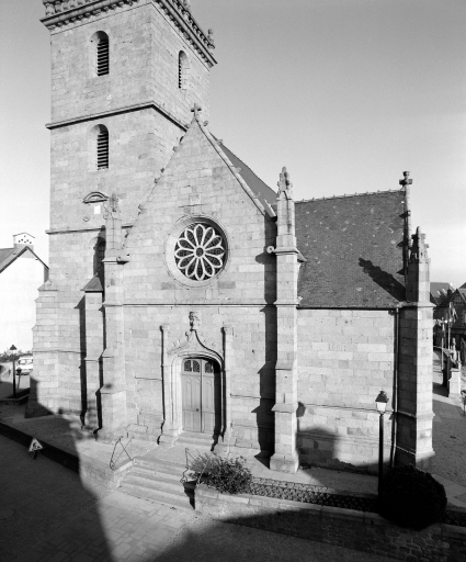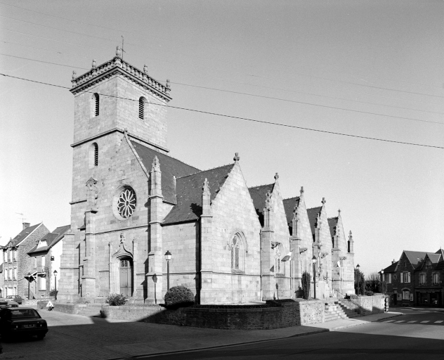 L'église est de plan allongé et présente une voûte d'ogives, des lambris de couvrement, un clocher latéral, une façade latérale à pignons multiples, et un chevet Beaumanoir : chevet à pans coupés et à pignons multiples. En pierre de grand appareil, l'édifice est pourvu d'une nef et de bas-côtés présentant une rangée de pignons à crochets que séparent des contreforts à ressauts, avec pinacles ornés de gargouilles. Le collatéral sud est plus orné et a des ouvertures qui sont plus richement décorées. Le collatéral nord comprend trois travées de fenêtres simples. La tour est haute de 27 mètres. La nef central, scandée par de puissants piliers, est couverte d'une voûte ogivale en pitchpin. Le pignon ouest présente une porte en arc brisé, accostée de deux pinacles et sommée d'une archivolte en accolade que décorent des choux frisés ; une rose datée de 1857 se voit au-dessus de la porte. A l'intérieur, la nef est voûtée en lambris de bois et séparée de chaque côté des collatéraux par cinq arcades qui reposent sur des colonnes polygonales. Les bas-côtés sont sous croisées d'ogives, avec des clefs sculptées dont plusieurs sont armoriées. Celui du nord présente la date de 17** gravée à l'envers sur la clef de voûte de la travée qui correspond à la porte latérale.