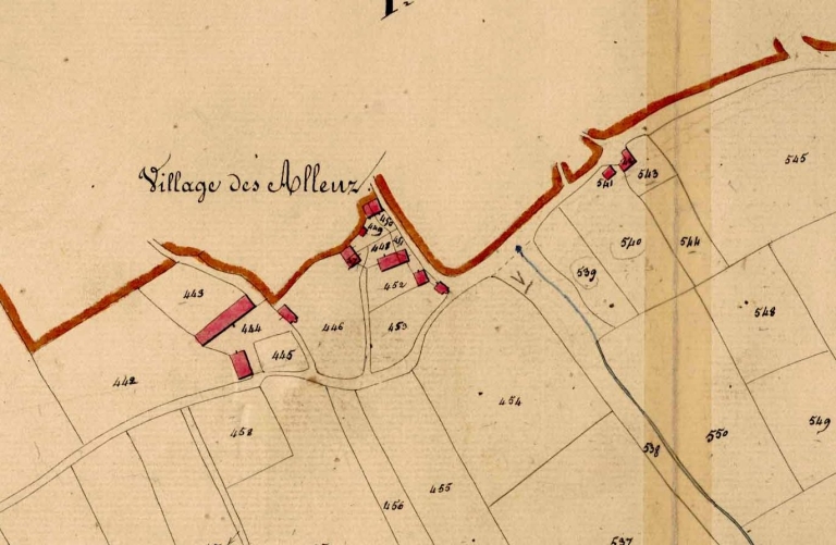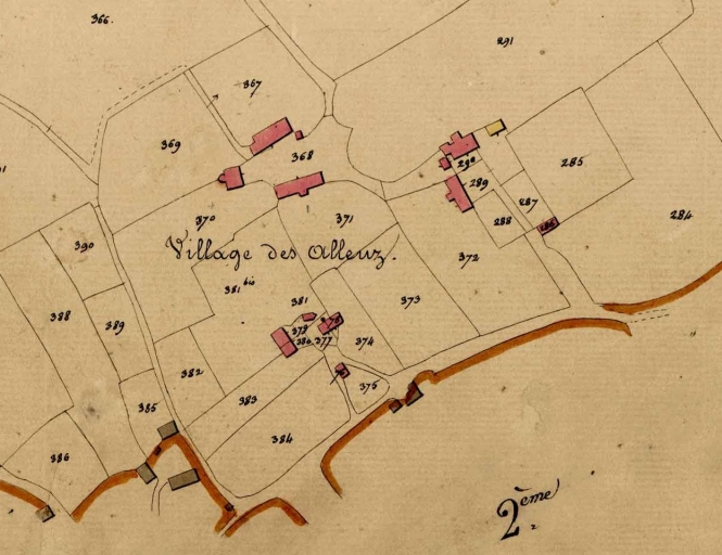 L´écart des Alleux est situé au sud-ouest du village de Louvigné-du-Désert, il s'agit d'un écart assez étendu. En 1833, lors de la levée du premier cadastre de la commune, la composition de cet écart était à peu près la même que la composition actuelle, quelques maisons intéressantes, connues par des photographies de 1970, ont disparu ou sont à l'état de ruine. Les bâtiments qui composent aujourd'hui ce village sont figurés sur ce document, puisque leur construction semble remonter pour le plus ancien au 16e siècle (logis 4), mais également au 17e siècle (fermes 2, 3, 5 et 6) et au 18e siècle (ferme 1). Certains bâtiments ont subi quelques remaniements en façade au cours du 20e siècle et sans doute dès le 19e siècle, comme c'est le cas pour une ferme, cependant quelques éléments remarquables subsistent dans cet écart et présentent une architecture intéressante permettant de les dater du 16e siècle et du 17e siècle, notamment grâce à leur décor : porte en anse de panier ou en plein cintre, baies au décor soigné, forme et décor des cheminées. Le site des Alleux se caractérise également par la présence d'un manoir et de sa chapelle.
