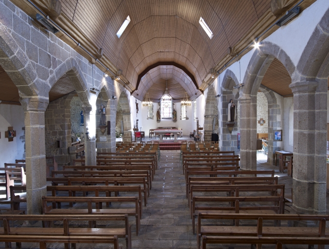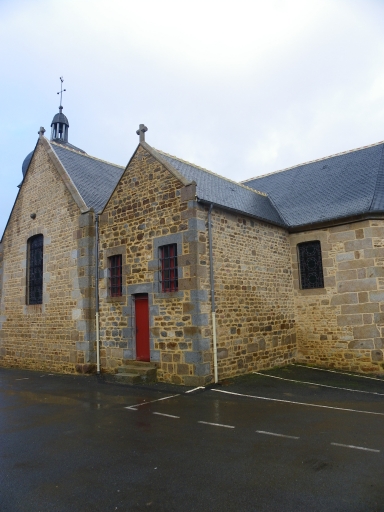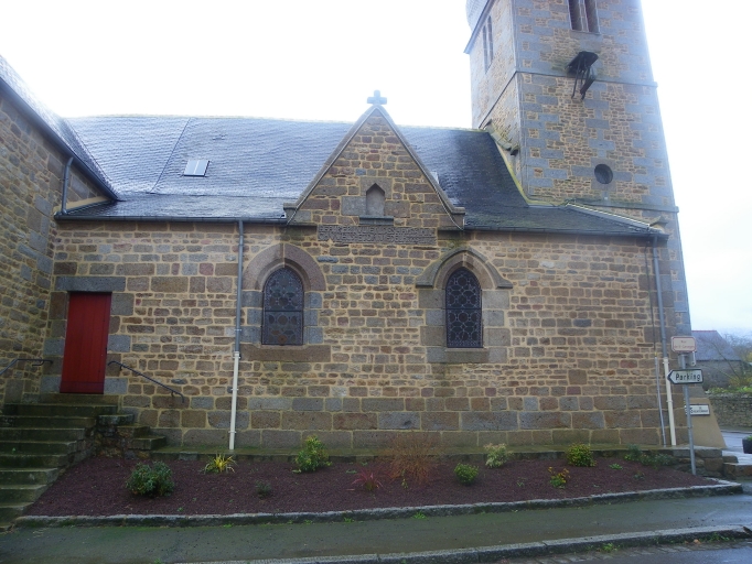 Le plan s´est complexifié au cours des modifications successives. La tour-porche compte trois niveaux et est à légers ressauts. Elle est couverte d´une toiture à l'impériale, surmontée d'un lanternon. On trouve un portail au sud et au nord. Le portail méridional est précédé d´une plate-forme et de six marches. On trouve un petit oculus et un écusson sur la facade occidentale, aujourd´hui illisible, ainsi qu´au premier niveau de la façade sud. On peut voir également un oculus centré au premier étage au nord et au sud, et des baies géminées au dernier niveau sur les quatre faces. Les collatéraux nord et sud sont à appentis, à pignons couverts. Ils ont tout deux été agrémentés d´inscriptions à l´origine implantées sur la chapelle de la Phelipotière. Ainsi, au sud, on trouve la date de 1663 et l´inscription DOTE PAR IEAN DESHAYES PHELIPOTIERE, tandis qu´au nord on peut lire : F.FAIRE PR IULIEN DESHAYES ET IANE CHVVEL SR ET DAME DE LA GODELINAIS. Le collatéral sud est percé d´un portail en plein cintre encadré par deux baies à arc brisé. Le linteau du portail porte la date de 1893 et est surmonté d´une niche à statue qui s´inscrit elle-même dans le gable. Au nord, une porte excentrée et deux baies à arc brisé complètent les ouvertures. On y trouve également un gable avec une niche surmontant l´inscription. Le transept sud est construit en pierre de taille sur sa facade occidentale et en moellon pour le reste de l´élément. On trouve une porte à l'ouest, alors qu´au sud une baie à arc déprimé éclaire le transept. Une petite console s´inscrit dans l´axe de la baie, le pignon est découvert. Le transept nord n´est percé quant à lui que d´une baie sur la face septentrionale, reprenant la forme de son pendant méridional. La sacristie flanque le transept sud, elle possède une porte centrée encadrée de deux fenêtres. Elle est surmontée d´un pignon découvert. Au nord, on trouve une chapelle latérale rectangulaire percée de deux petites baies à l´est et au nord. La baie voit son linteau agrémenté d´un arc infléchi sculpté et son encadrement est chanfreiné. Deux puissants contreforts cantonnent l´ensemble. Ici aussi, le pignon est découvert. Le chevet polygonal, à cinq pans, est percé d´une baie dans quatre pans de mur. Elles sont à arc brisé pour trois d´entre elles et à linteau délardé en arc déprimé pour la dernière.