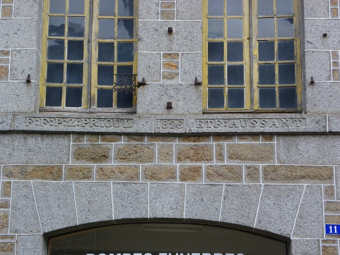 Parmi le grand nombre de maisons à boutique du bourg, celle-ci est une des seules à avoir conservé ses éléments de construction originels. La maçonnerie alterne entre des moellons de granit et de la pierre de taille de granit bleu, que l'on retrouve pour les chaines d´angle, ainsi que pour les encadrements. Elle compte un étage carré couronné par une toiture en pavillon et à coyaux. La vitrine possède un linteau à arc segmentaire. Les deux fenêtres de l´étage sont quant à elles dotées de linteaux délardés légèrement déprimés. Sur le bandeau en granit entre le rez-de-chaussée et l´étage on peut lire l´inscription : « F : F : P : Z : PRIOUL 1828 ETF : AUSSANT ».