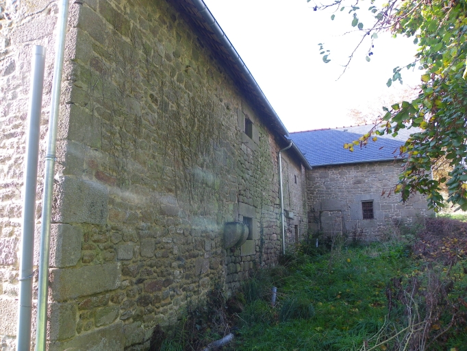 L´ensemble est composé d´un logis et d´une partie agricole à l´est. Le logis est doté d´un plan en L, avec un retour en équerre sur la façade postérieure. On compte un étage carré, surmonté d´une toiture à deux pans couverte d´ardoise. La maçonnerie est en pierre de taille de granite, le mur étant couronné d´une corniche ouvragée. Le pignon occidental est doté d´une chevronnière en granite. On peut diviser la façade en deux ensembles, un logis à l´ouest et une partie utilitaire à l´est, sans doute un cellier. On compte d´ailleurs trois souches de cheminées délimitant les différentes parties, dont une à la mitre ouvragée en demi-cercle et moulurée. Le terrain en légère pente a induit un décrochement entre les niveaux des deux portes. La première, à l´ouest, est à arc en plein cintre et précédée d´un emmarchement à quatre degrés, alors que la seconde est dotée d´un linteau délardé en anse de panier. Le logis est surmonté d´un grenier, alors que la partie orientale semble être surmontée d´une chambre. La fenêtre à appui mouluré de cette partie renforce cette hypothèse. On trouve également un jour en archère éclairant l´escalier dans oeuvre. La façade postérieure est percée de deux portes, dont une porte haute qui a été bouchée. Le retour est également percé d´une porte avec un encadrement ouvragé et d´une petite fenêtre. La maçonnerie de la façade postérieure et du retour est en moellons de granite. La grange a vu son mur remonté, elle est percée d´une porte charretière avec linteau en bois. La maçonnerie est en pierre de taille pour moitié et moellons. Une porte piétonne a été bouchée et possède aujourd´hui une petite fenêtre, une porte haute complète les percements de la façade. Des corbeaux ont été réemployés en façade, en panneresse ou boutisse.