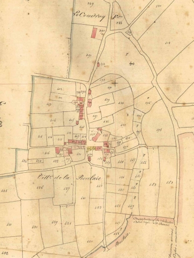 L'écart de la Boulaie est l'un des plus importants de la commune. Il l'était déjà en 1833, lors de la réalisation du premier cadastre de la commune. Il était à l'époque composé de plusieurs alignements de trois ou quatre logis. L'un des alignements, situé au sud-ouest, est représenté en jaune sur le cadastre de 1833, ce qui signifie qu'il était déjà en ruines à cette époque. Certains des bâtiments de l'écart présentent une architecture caractéristique de leur époque de construction. C'est le cas de l'un des bâtiments situés au sud de l'écart qui porte la date de 1786 : forte pente de toiture, linteau de baie en arc segmentaire... D'autre bâtiments de cet écart témoignent de la construction au début du 19e siècle, le bâtiment situé le plus à l'est (désigné sous le nom de "Le Coudray" sur le cadastre de 1833) est en effet daté de 1831. Son architecture est propre à cette époque de construction : pente de toiture encore assez forte, percements réguliers en façade, linteaux droits des baies... De nombreuses constructions de cet écart ont été remaniées, ainsi, plusieurs bâtiments portent des dates faisant référence au 18e siècle (1738, 1786), toutefois, ces bâtiments ont subi de nombreuses transformations, particulièrement au niveau des ouvertures. Des portes en plein cintre à doubles rouleaux murées ou remployées subsistent sur quelques bâtiments de l'écart, elles témoignent de l'architecture du 17e siècle. Certains bâtiment, situés au sud et à l'est de l'écart, datent quant à eux de la seconde moitié du 19e siècle. Aujourd'hui, cet écart se développe encore avec la construction de maisons neuves. En 1833, lors de la réalisation du premier cadastre, il existait encore six fournils dans cet écart. La plupart des ces fournils ont aujourd'hui disparu.