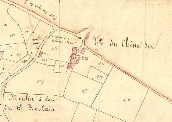 En 1833, lors de la réalisation du premier cadastre de la commune, seul un alignement de deux logis, un logis indépendant à l'ouest de l'alignement et un fournil au sud existaient à cet emplacement. Les bâtiments qui sont figurés sur ce premier cadastre existent encore aujourd'hui. Un des linteaux de baies de celui qui est situé à l'ouest porte l'inscription suivante : "ANNE DAVOINE/JOSEPH LESAGE 1797". La tradition orale nous a rapporté que ce bâtiment avait été construit au début du 20e siècle par un maçon rennais du nom de Janvier. L'architecture de ce bâtiment, qui évoque celle des villas balnéaires construites à la même époque, témoigne de cette période : usage du granite sous la forme de pierre de taille, percements organisés en travées, oculus, épis de faîtage, girouettes, crête de toit et lambrequins en zinc... La tour constitue véritablement le "chef-d'oeuvre" de cette construction, c'est-à-dire qu'il s'agit de la partie sur laquelle il existe le plus de décor : colonnes, toiture en pavillon, oculus en zinc, épis de faîtage, girouettes et crête de toit... Aujourd'hui, les baies donnant au sud et situées au rez-de-chaussée surélevé et au premier étage de la tour sont murées par des panneaux de bois. Grâce à une carte postale du début du 20e siècle, sur laquelle figure ce bâtiment, nous savons que ces baies étaient fermées à l'origine par des menuiseries, cette partie n'était donc pas à claire-voie. Comme le toit, les baies étaient à l'origine équipées de lambrequins. Cette tour abritait vraisemblablement un escalier desservant les différents niveaux du bâtiment. Sur cette carte postale du début du 20e siècle, ce bâtiment est mentionné sous l'appellation "Château du Chêne Sec".
