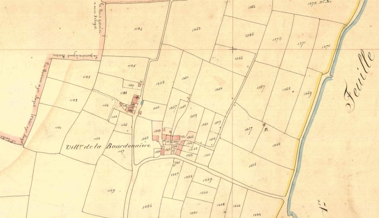 Montours. Section A dite de Bonteville, en deux feuilles, 2ème feuille, du n°966 au n°1373, levée par Maudet, géomètre de première classe. [1833], échelle 1/2500 e. (A.D. Ille-et-Vilaine).