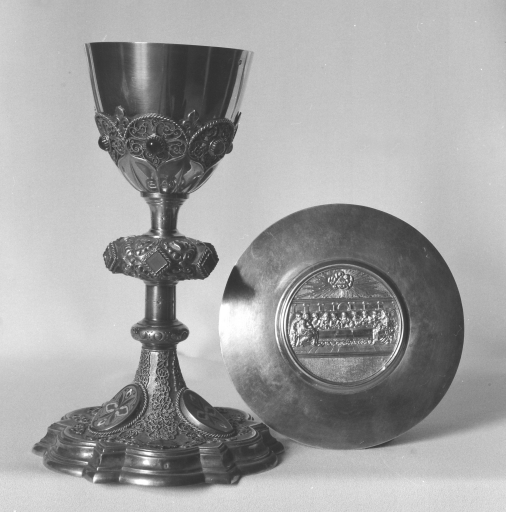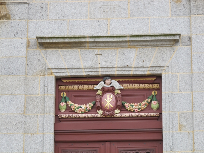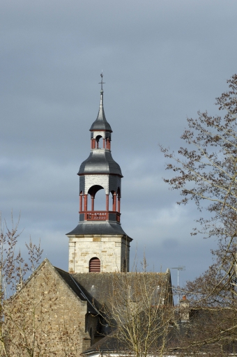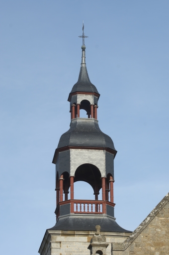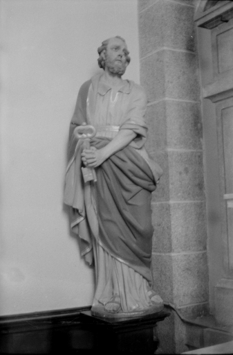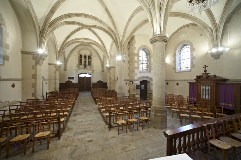 Au sud, on remarque l'ancien chapitre du 17e siècle. Le sol est dallé de pierres diverses dont certaines sont pavées. L'une d'elles porte la date, incomplète : 26 IANV 167. Dans la tour du clocher édifiée en 1842, il y a les anciennes cloches, l'une de 1439, l'autre de 1747. Dans le choeur, deux statues de bois polychrome se font face. Elles représentent Saint Pierre et Saint Paul. De facture très réaliste, elles ont sans doute été réalisées à la fin du 18e siècle, peut-être au début du 19e siècle. L'ensemble de l'édifice est vouté d'ogives.".