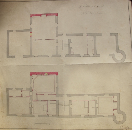 - Premièrement, au bout méridionnal d´un enbas dans lequel se trouvent le pressoir avec tous ses ustensiles et un tour de pile en pierre de taille. Chambre basse au dessus de la partie où se trouve le tour de pile, laquelle chambre est planchéiée et a sa porte d´entrée au midi ; grenier planchéié tant au dessus de la dite chambre qu´au dessus du pressoir.
