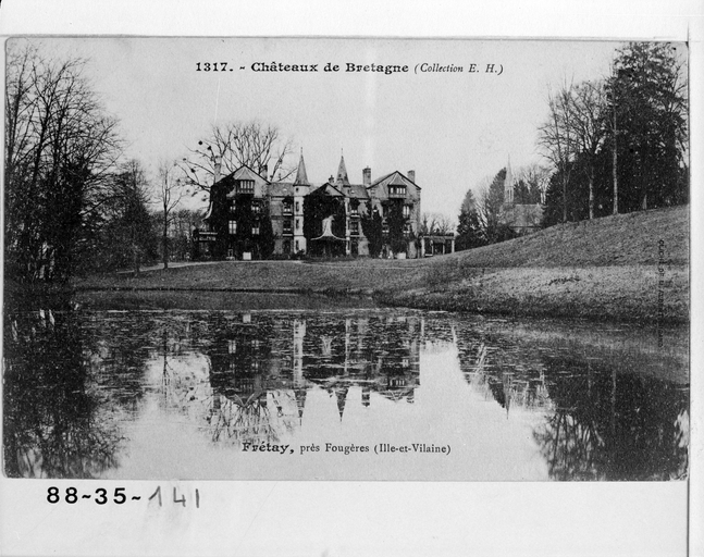 Le château de Fretay, détruit vers le milieu du 20e siècle, avait été construit au 19e siècle sur le site d'un ancien manoir ; une ancienne chapelle était aménagée en relais de chasse dans les années 1970. La propriété, close de murs, existe toujours même si de l'ancien château ne subsistent que la chapelle, les murs de clôture et les grilles d'entrée. Ce site est occupé de longue date puisqu'il est mentionné dès le 12e siècle, il appartenait en effet aux seigneurs de Fretay en 1160. Fretay passe ensuite entre les mains de la famille de la Vieuville aux 14e et 15e siècles. Au milieu du 15e siècle, Fretay passe par succession aux le Vayer puis par alliance à la fin du 15e siècle aux de Poix, seigneurs de Fouesnel. Au début du 18e siècle, le domaine est vendu aux Becdelièvre, vicomtes du Bouexic, qui le revendent en 1731 aux d'Andigné. La famille Becdelièvre était également propriétaire du domaine de la Folletière au 16e siècle. Au 19e siècle, les propriétaires de ce château étaient les de Saint-Gilles. Au 18e siècle, la Maison Neuve, la métairie du Bas-Fretay, le Haut Villiers, Ville Courte, Guéménard, la Folletière, le Bas Châtellier, le moulin de Fretay et le moulin de Guéménard dépendaient de Fretay. En 1833, lors de la réalisation du premier cadastre de la commune, il existait à cet emplacement, un petit groupe de constructions au nord, désigné sur ce document comme le "village" de Fretay ; au sud de ce groupe de constructions, se trouvait les bâtiments de l'ancien manoir qui étaient implantés autour d'une cour. Enfin, au sud de ces bâtiments, s'élevait le moulin de Fretay. D'après les cartes postales du début du 20e siècle, sur lesquelles figure le château de Fretay, le style architectural de ce bâtiment témoignait du milieu du 19e siècle. Ainsi, Paul Banéat mentionne le fait que la chapelle avait été construite en 1854, la date de construction du château était vraisemblablement antérieure de quelques années. L'architecture de ce château témoignait d'ailleurs de l'architecture de la première moitié du 19e siècle et particulièrement d'un style Troubadour faisant allègrement référence à l'architecture médiévale. Seules quelques cartes postales du début du 20e siècle nous permettent de connaître l'aspect de ce château ; son style était très éclectique et mêlait des éléments de l'architecture médiévale (tours...) à des éléments de l'architecture classique (avant-corps, frontons triangulaires...). Plusieurs châteaux furent construits sur des sites d'anciens manoirs autour du milieu du 19e siècle dans la commune : la Vieuville, la Folletière et Fretay. L'architecture de ces trois bâtiments atteste de l'extraordinaire richesse et de l'éclectisme de l'architecture de cette époque car ils témoignent tous d'un style très différent : le style néo-classique pour la Folletière, le style néo-gothique pour la Vieuville et le style "Troubadour" pour Fretay.
