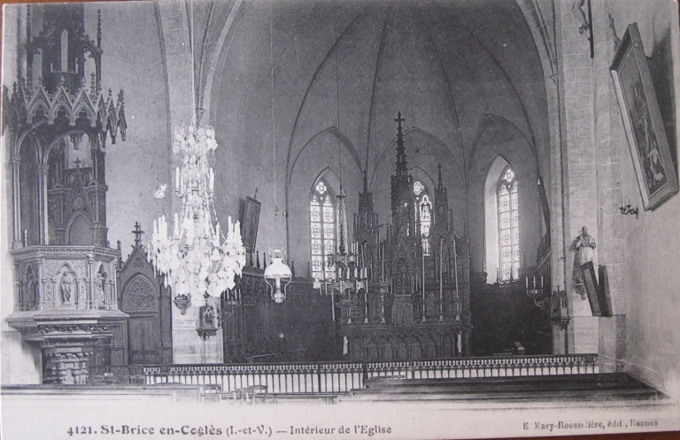 Dédiée à saint Brice, évêque, l'église actuelle de Saint-Brice-en-Coglès est la troisième construite en ce lieu. En effet, l'église primitive fut en grande partie reconstruite à la fin du 18e siècle, comme l'indique l'inscription gravée sur le linteau de la grande porte occidentale : STRUCTA SUM ANNO 1776. La tour du clocher, construite en 1776 est reconstruite en 1820. Détruit en 1855, l'édifice est réédifié sous la direction de l'architecte Pierre Jourdin en 1858. La nouvelle église rejoignait l'ancienne tour de 1820. En juin 1862, un nouveau maître autel en bois fut installé, œuvre de M. Hérault de Rennes, il était décoré de dessins dorés et polychromés. En 1867, furent posés les deux autels latéraux, sortis également des ateliers Hérault et décorés par M. Lemoine. Les stalles et les boiseries du chœur, de style néo-gothique, furent réalisées en 1878-1879 par M. Hérault fils. Les statues du maître-autel et des autels latéraux sont des œuvres en terre cuite de la deuxième moitié du 19e siècle. La paroisse de Saint-Brice possède également un calice et une patène en argent de la deuxième moitié du 17e siècle. Au bas de la nef, se trouve une grande plaque de marbre noir sur laquelle est gravée en lettres d'or la liste des 63 victimes de la guerre 1914-1918. Tout à côté, il y a la liste des 15 soldats morts pendant la Seconde guerre mondiale de 1939-1945 et des 4 briçois morts en Indochine et en Algérie.