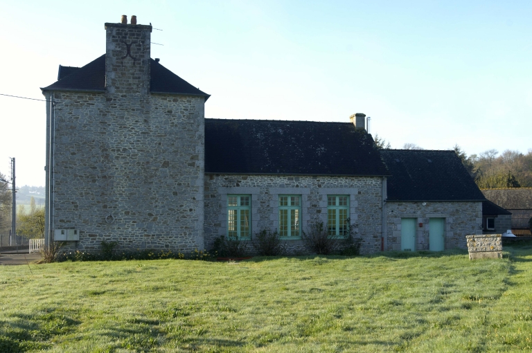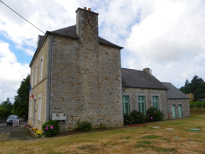 L'ensemble que compose la mairie-école et la salle communale se caractérise par deux entités architecturales clairement identifiables. Bien que ces deux éléments soient mitoyens et donnent un plan en T à l'ensemble, on observe d'une part la salle communale, ouverte sur la cour au sud et la mairie à l'est. La mairie est de facture modeste, ne se différenciant d'une simple maison de village que par son implantation mitoyenne à l'école et les plaques sur sa façade présentant sa fonction, Ecole et Mairie. Elle dresse sa façade principale à l'est et est implantée légèrement en retrait de la route menant à Saint-Marc-le-Blanc. On observe une organisation classique de la façade, ordonnancée, à trois travées de fenêtres sur deux niveaux, complétée par une petite lucarne dominant la travée centrale. L'austérité est de mise, les seuls décors observés sont deux bandeaux de granite marquant chaque niveau et une corniche également en granite. La maçonnerie est composée de granite jaune et bleu. Le granite jaune est utilisé pour les murs, tandis que le granite bleu sert pour les encadrements des ouvertures et les chaînes d'angle. Ce jeu de couleur entre les deux matériaux participe aussi au décor de l'ensemble. La toiture, couverte en ardoise, est à croupes. Les murs latéraux sont moins soignés et composés de moellon grossier, alternant granite bleu et jaune. La salle communale est un bâtiment modeste. Elle compte un seul niveau mais reprend au sud les éléments de façade de la mairie. Elle est percée de deux portes et d'une fenêtre au sud, formant trois travées avec les fenêtres de la façade nord. La toiture, à longs pans est également couverte d'ardoise.
