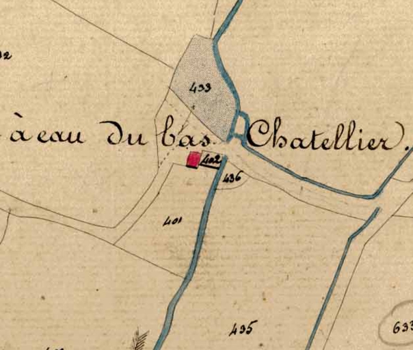 Appartenant à la seigneurie du Bas Châtellier, dont l'ancien manoir est proche, cet ancien moulin fut construit à la fin du 16e siècle ou au début du 17e siècle, avant de subir des travaux de modernisation au début du 20e siècle. Les soubassements sont d'origine, tandis que la superstructure, bien qu'ayant remployé des éléments anciens est plus récente.