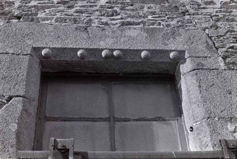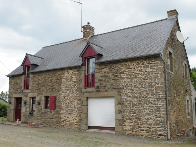 Les bâtiments sont élevés en moellon de granite et de schiste, les encadrements des ouvertures utilisent la pierre de taille de granite, deux d'entre elles sont décorées de boules sur leur linteau au niveau du chanfrein. Le toit à longs pans est couvert d'ardoise. La façade postérieure possède une ouverture en plein cintre. La cheminée monumentale de la salle est ornée d'un écu sur son linteau, on y aperçoit un décor de fleur de lys et une inscription au-dessus.