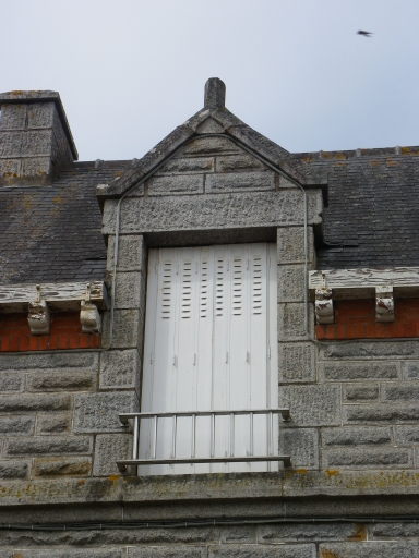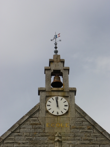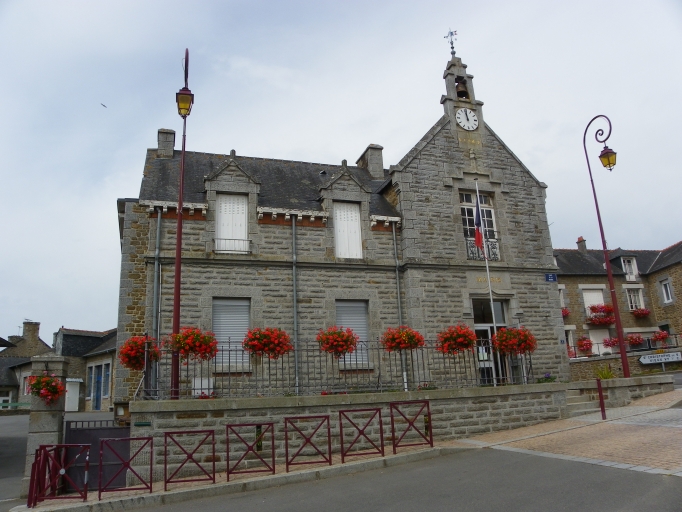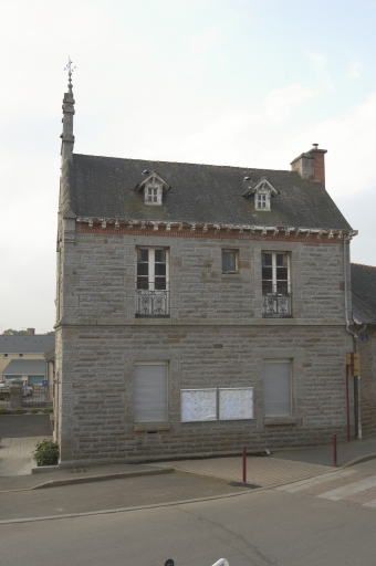 Elevée en granite bleu, la mairie se dresse face à l'église, implantée de l'autre côté de la route menant à Saint-Brice-en-Coglès. Elle indique en lettres d'or son statut de Mairie et d'Ecole sur le pignon-façade est. Ce dernier inscrit pleinement le bâtiment dans son époque de constrution, même si on peut également y voir un esprit quelque peu avant-gardiste à la fin du 19e siècle, puisque le pignon-façade se démocratisera dans l'architecture privée au début du siècle suivant. Le pignon, découvert, porte dans sa partie supérieure l'horloge et un clocheton. La façade orientale est percée de trois travées de fenêtres sur deux niveaux, tandis que la façade nord compte deux travées, l'ensemble étant souligné par un bandeau de granite entre le rez-de-chaussée et l'étage. Le mur est couronné d'un bandeau en briques que l'on retrouve aussi sous les appuis de fenêtre du rez-de-chaussée. La maçonnerie en pierre de taille à bossage donne une certaine originalité à l'ensemble. Le décor apparaît essentiellement au niveau des ouvertures, avec un linteau de porte d'entrée en accolade et le linteau de la fenêtre de l'étage reprennant schématiquement une accolade avec fleuron. On retrouve donc de manière stylisée, les éléments de décor présents sur l'église paroissiale. La façade postérieure, sur cour, est traitée en granite jaune. Le mur pignon est ici couvert et le décor se concentre sur les encadrements de fenêtres et les chaînes d'angle en pierre de taille à bossage. Les salles de classes, disposées au nord de la cour, reprennent les mêmes décors. L'originalité tient ici aux ouvertures, avec une porte d'entrée flanquée de deux fenêtres.