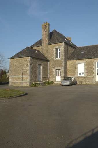 Le bâtiment est composé d'une partie centrale complétée par deux éléments secondaires à l'est et à l'ouest. On trouve également sur la façade postérieure une aile en retour d'équerre, donnant à l'ensemble un plan en T. La partie centrale est dotée de trois travées de fenêtres sur deux niveaux., chaque niveau étant marqué en façade par un bandeau de granite. La maçonnerie est en moellon de granite jaune, complété pour les chaînes d'angle, les encadrements et les bandeaux par de la pierre de taille en granite bleu. La toiture est à longs pans et croupes, couverte en ardoise. Les souches de cheminée sont quant à elle élevées en briques chaînées de granite. Les parties latérales sont identiques, percées d'une porte centrale flanquée dans sa partie haute de deux fenêtres, le tout étant couvert d'une toiture à deux pans et croupe. L'aile postérieure accueillait une salle de classe, dotée de deux portes et de deux fenêtres à l'ouest.