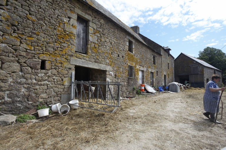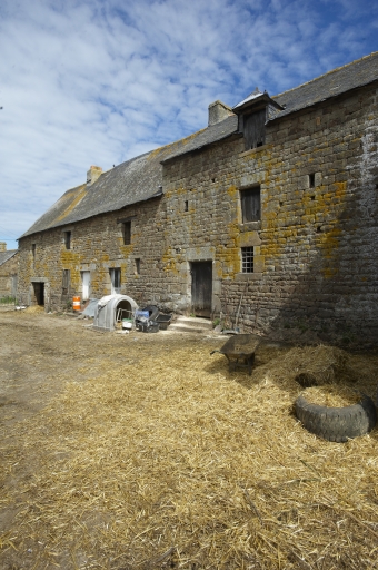 La façade principale de l'alignement est élevée en grand appareil régulier de granite, sauf pour la partie reprise qui est en petit appareil irrégulier. Les encadrements des ouvertures sont également en grand appareil régulier et présentent pour certains des décors typiques de leur époque de construction. Ainsi, on observe quelques ouvertures aux bords chanfreinés, dont une porte au linteau orné de boules et plusieurs inscriptions sur des linteaux : 1633 IHS IV ; F : SAVDRAY : 1669 ; IHS ; 1744. Les toits à longs pans sont couverts en ardoise.
