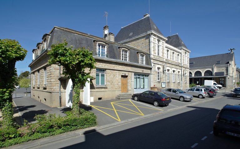 Dans les années 1870, des bâtiments publics sont construits à Saint-Aubin-du-Cormier, c'est le cas de la mairie qui remplace en 1872 l'ancienne mairie située à l'extrémité est de la rue de l'Écu. Des halles sont également construites en 1877 au nord-ouest de la mairie ; elles remplacent les anciennes halles qui occupaient la Place A. Veillard. L'emplacement des anciennes halles et de l'ancienne mairie est encore visible sur le premier cadastre communal réalisé en 1833. Aux archives départementales d'Ille-et-Vilaine, il existe plusieurs projets d'emplacement de la mairie et de la halle datés de 1867 ; ils sont signés de l'architecte Leray. La mairie, tout comme les halles, a été construite par l'architecte Aristide Tourneux. Ces deux bâtiments forment d'ailleurs un ensemble très cohérent en termes d'architecture : même maçonnerie de moellon de grès rehaussée par des chaînages d'angles, des encadrements de baies et des bandeaux en pierre calcaire, même rez-de-chaussée avec des encadrements et des chaînages traités en granite, sans doute dans le but de protéger la pierre calcaire, sensible à l'humidité. L'usage d'un tel matériau non local, la pierre calcaire, témoigne d'une évolution propre à la seconde moitié du 19e siècle. Ainsi, l'amélioration des voies et des moyens de communication (arrivée du chemin de fer au milieu du 19e siècle, canaux...) a permis "d'importer" plus facilement et donc à moindre coût des matériaux non locaux. Ceci a eu une grande incidence sur la diversification de la production architecturale de cette époque par des jeux de couleurs propres à l'alternance de matériaux notamment ou bien par de nouvelles formes plus faciles à réaliser avec certains matériaux. Le bâtiment abritait la justice de paix au rez-de-chaussée et la mairie à l'étage.