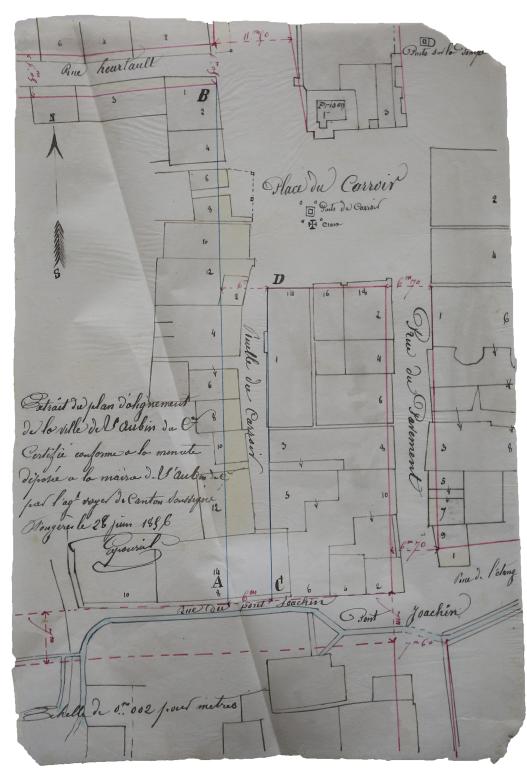 2 place Alexandre Veillard : le plan de 1798 indique deux poteaux soutenant un porche. La maison appartenait à la veuve Pouteau. Il s'agit de la parcelle n°239 sur le cadastre de 1833. Ce porche n'apparaît plus sur le plan d'alignement de 1851 (Archives municipales : C10 1) : a-t-il été supprimé ou clos pour partie ?