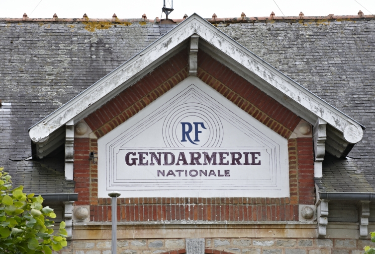 Le bâtiment est élevé sur une cave. Il possède une maçonnerie en grès ; le soubassement est traité en moellon à tête dressée, alors que le reste de la maçonnerie est en moellon équarri. Les linteaux de baies, les bandeaux, l'intérieur du fronton triangulaire ainsi que les souches de cheminées sont traités en brique. La façade du bâtiment est rythmée par cinq travées ; les baies qui forment ces travées possèdent des linteaux en arc segmentaire. La travée centrale se termine par un fronton triangulaire qui porte l'inscription : RF/ GENDARMERIE/NATIONALE. Le toit à croupes est couvert d'ardoise ; par ailleurs, il existe une corniche composée de corbelets en bois.