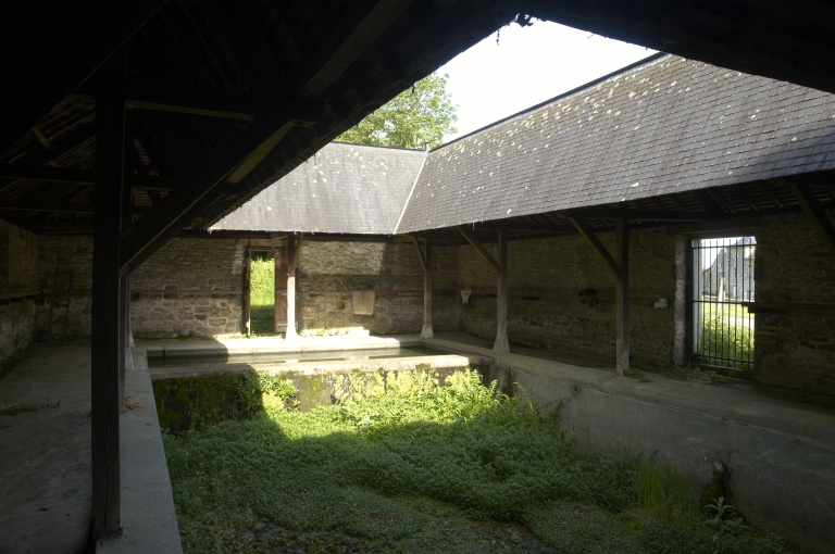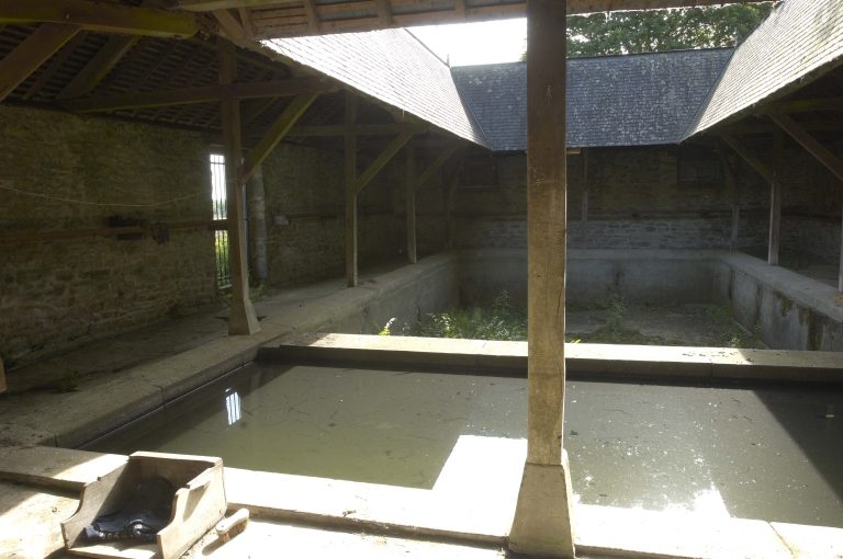 Ce lavoir a été restauré il y a quelques années par le Conseil Général d´Ille-et-Vilaine dont il est la propriété. Il fait partie du site composé du bois de Rumignon et du parc du Château de Saint-Aubin-du-Cormier ouvert au public par le Conseil Général en 1989. Le Conseil Général a acquis 17 hectares du bois de Rumignon en 1993 afin de préserver ce site et d´en faciliter l´accès au public. L´originalité de ce lavoir réside dans le fait qu´il soit totalement fermé. Les quatre pans de murs, en moellon de grès, forment en effet un carré autour d´une cour à ciel ouvert (cf. atrium-impluvium romain). Ces quatre côtés sont couverts de toits à longs pans en ardoise dont l´un des versants, incliné vers l´intérieur, permet la récupération des eaux de pluie et l´alimentation du bassin central du lavoir. Certains lavoirs étaient des bâtiments beaucoup plus simples que celui-ci, prenant la forme d´un préau (lavoir de Saint-Jean-sur-Couesnon), alors que d´autres avaient des formes plus insolites. C´est le cas des bateaux-lavoirs qui existaient sur les grands cours d´eau dans les villes (il en existe encore sur la Mayenne à Laval par exemple). Bien que sa forme soit atypique, comme la majorité des autres lavoirs, la construction de celui-ci date du début du 20e siècle. C´est effectivement à cette époque que de nombreux lavoirs sont construits dans un souci de développement de l´hygiène dans les communes. Le lavoir servait au lavage et au rinçage du linge. Ce lavage pouvait également se faire à domicile, le lavoir ne servait alors qu´au rinçage du linge, étape de la lessive qui nécessitait de grandes quantités d´eau. Comme ici, le bord du lavoir était généralement incliné vers le bassin, les femmes s´agenouillaient donc à même le sol ou bien dans un bac en bois appelé « carrosse » afin de jeter le linge dans l´eau et de le frapper avec un battoir dans le but de l´essorer. Le « carrosse » évitait aux femmes d´avoir les genoux trempés, notamment en période hivernale. Les femmes qui fréquentaient les lavoirs étaient appelées des lavandières. Certains lavoirs étaient équipés de cheminées pour faire bouillir le linge et pour la production de la cendre nécessaire au lavage et surtout au blanchissement du linge. Le linge était rapporté au domicile à l´aide d´une brouette avant d´être étendu et séché. Comme dans le cas présent, de nombreux lavoirs possédaient deux bassins, l´un réservé au lavage et l´autre au rinçage, ce qui permettait de conserver une eau claire pour cette seconde étape. Le rinçoir est souvent de taille plus restreinte que le bassin de lavage. Les lavoirs étaient utilisés quelque soit la saison, toutefois, les grosses lessives ne se faisaient que deux fois par an et pouvaient durer plusieurs jours. Au-delà de leur rôle fonctionnel (lavage du linge), les lavoirs possédaient également un rôle social incontestable. Il s´agissait en effet d´un des rares lieux de rencontre et de discussion des femmes au cours de la première moitié du 20e siècle. La fréquentation des lavoirs était essentiellement féminine. Certaines femmes s´y rendaient à titre individuel, afin de laver le linge de leur famille, mais d´autres y exerçaient leur métier de laveuse, blanchisseuse et y lavaient le linge d´autres familles. L´utilisation des lavoirs publics a décliné à partir du milieu du 20e siècle, époque d´introduction des premières machines à laver le linge dans les foyers. D'après un document d'archives, à Saint-Aubin-du-Cormier, en 1903-1904, un lavoir couvert est construit par l'entrepreneur Janvier, sur les plans de l'architecte Lemée ; le devis des travaux s'élevait à 5000 francs de l'époque. Il s'agit selon toute vraisemblance de ce lavoir.