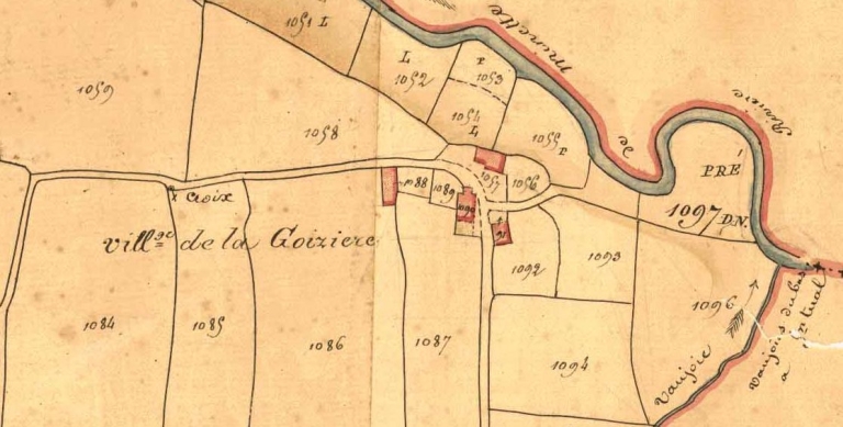 En 1833, lors de la levée du premier cadastre communal, il semble qu'il existait quatre propriétés différentes à la Goizière ; le lieu est d'ailleurs mentionné comme un "village" sur le premier cadastre. Ce bâtiment correspond au bâtiment le plus au nord (parcelle 1057 du cadastre ancien). Ce bâtiment a été construit au cours des années 1660 ainsi qu'en témoigne la date de 1666, portée sur le linteau de la fenêtre du rez-de-chaussée. Son architecture est tout à fait représentative de cette époque de construction. Ainsi, la façade en pierre de taille, la forte pente de toiture, le décalage entre la hauteur de la porte et de la fenêtre, la présence d'un escalier en vis dans un angle... sont des éléments qui sont propres à l'architecture de cette époque et que l'on retrouve sur d'autres bâtiments de la commune datant peu ou prou de la même époque (Launay, la Haute Haye... ) Toutefois, ici, les baies sont quadrangulaires alors que sur les exemples cités précédemment, les portes sont en plein cintre ou en arc en anse de panier. A partir de la seconde moitié du 17e siècle, progessivement, les portes en plein cintre laissent place à des portes à linteaux droits. Ce bâtiment est également très représentatif d'une typologie que l'on retrouve dans la commune à cette époque, à savoir le logis composé de deux pièces à feu superposées, avec desserte de celle de l'étage par un escalier en vis. Des logis de ce type existent encore à Launay et à la Haute Haye. Nous ne connaissons malheureusement pas le nom ni la fonction du commanditaire de ce bâtiment, toutefois, la qualité de l'architecture, la présence d'une pièce à feu à l'étage et d'équipements de confort tels que les cousièges ou encore le lave-mains de l'étage témoignent de son rang. Le bâtiment a probablement été déclassé en ferme au 19e siècle, les autres bâtiments se trouvant au sud de la cour ont alors servi de dépendances. Des photographies du bâtiment à la fin des années 1960 nous permettent de voir qu'à l'époque, la fenêtre d'origine avait été transformée en porte et que la porte avait été transformée en fenêtre. Ce cas de figure est fréquent à cette époque car, la pièce unique d'origine était souvent divisée en deux afin de créer une salle et une chambre. Le cloisonnement se faisait entre la porte et la fenêtre ; la salle se trouvait dans la partie possédant la cheminée. Comme traditionnellement la fenêtre se trouvait du côté de la cheminée, sa transformation en porte était nécessaire afin de permettre un accès direct dans la salle sans avoir à passer par la chambre. Le cadastre de 1833 témoigne du fait que les dimensions de ce bâtiment étaient plus importantes à l'origine, en effet, à l'ouest, il existait une partie dont la façade était en retrait par rapport au bâtiment qui existe toujours actuellement. Des traces de ce bâtiment existaient encore dans les années 1960 lors de la réalisation d'une précédente enquête d'inventaire du patrimoine.