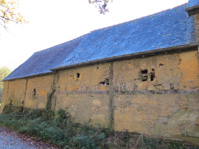 La maçonnerie du logis est composée de moellon de granite bleu, les encadrements de baies sont réalisés en pierre de taille de granite. La façade principale est composée de trois travées, il s'agit d'un logis de type ternaire, avec rez-de-chaussée, étage carré, et comble. La façade est ornée d'une niche à statue au premier niveau, cet élément est très fréquent dans la seconde moitié du 19e siècle. La toiture à croupes est couverte en ardoise. Le bâtiment possède trois souches de cheminée : une sur chaque pignon et une sur le mur gouttereau. Les dépendances sont élevées en moellon de grès avec encadrement en pierre de taille pour l'étable. La grange a sa façade principale en moellon de grès et l'arrière en pan de bois. Le bâtiment terminant l'alignement était en moellon de grès et en pan de bois, actuellement la façade principale est remontée en parpaing de béton. Les toitures sont toutes à longs pans et couvertes en ardoise.