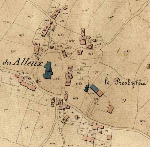 Tableau d'assemblage du plan parcellaire de la commune de Saint-Ouen-des-Alleux, Canton de Saint-Aubin-du-Cormier, Arrondissement de Fougères, Département d'Ille-et-Vilaine. Terminé sur le terrain le 26 août 1833, sous l'administration de Mr. Cahouet, Préfet, Mr Derennes, Maire, et sous la direction de Mr Lambert, Directeur des Contributions, Mr Lesné, Géomètre en chef, par Mrs Delamaire et Margueritte, Géomètres du cadastre, échelle 1/10000e. (A.D. Ille-et-Vilaine).