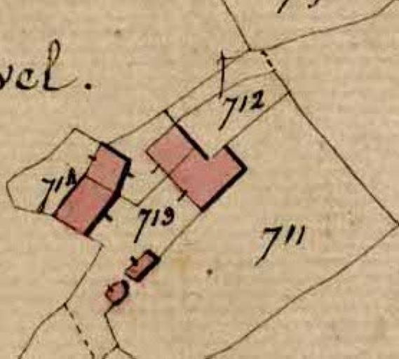 Tableau d'assemblage du plan parcellaire de la commune de Gosné, Canton de Saint-Aubin-du-Cormier, Arrondissement de Fougères, Département d'Ille-et-Vilaine. Terminé sur le terrain le 16 décembre 1833, sous l'administration de Mr. Cahouet, Préfet, Mr Paraige, Maire, et sous la direction de Mr Lambert, Directeur des Contributions, Mr Lesné, Géomètre en chef, par Mr Cheval, Géomètre du cadastre, échelle 1/10000e. (A.D. Ille-et-Vilaine).