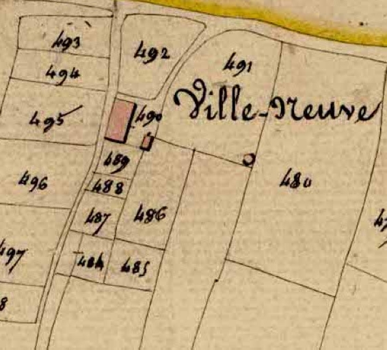 Tableau d'assemblage du plan parcellaire de la commune de Gosné, Canton de Saint-Aubin-du-Cormier, Arrondissement de Fougères, Département d'Ille-et-Vilaine. Terminé sur le terrain le 16 décembre 1833, sous l'administration de Mr. Cahouet, Préfet, Mr Paraige, Maire, et sous la direction de Mr Lambert, Directeur des Contributions, Mr Lesné, Géomètre en chef, par Mr Cheval, Géomètre du cadastre, échelle 1/10000e. (A.D. Ille-et-Vilaine).
