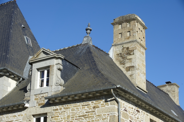Cet ancien manoir a un plan bâti en L, il est composé de deux corps de bâtiment. Il est construit en moellon de granite, seuls les encadrements d'ouvertures et les pierres des chaînages d'angle sont en pierre de taille. Parmi les deux corps de bâtiment, on remarque notamment le pavillon dont le toit est très élevé, ce bâtiment domine donc l'ensemble. A noter également, les lucarnes au fronton triangulaire et décor de volutes sur les côtés, les belles souches de cheminées et un épi de faîtage en plomb en forme de vase.