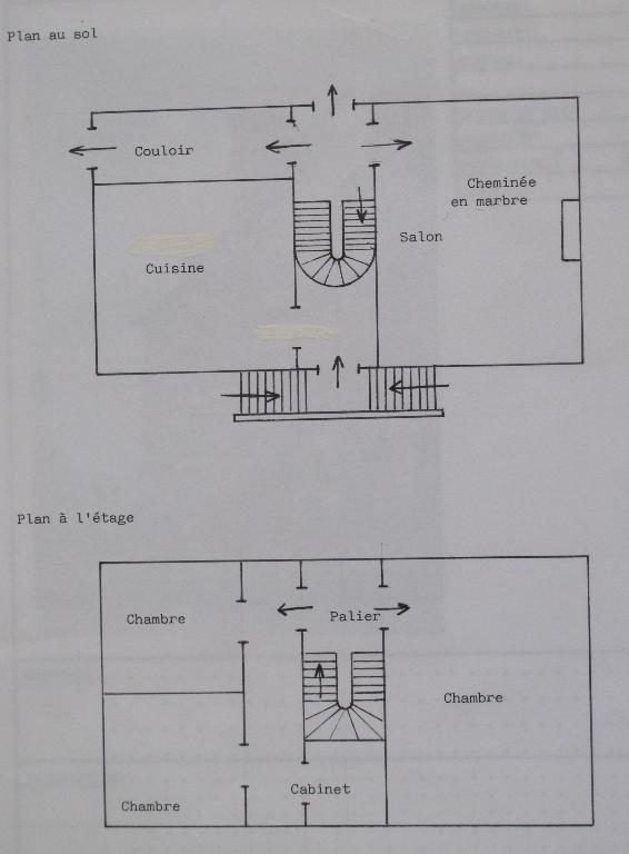 Des croquis réalisés en 1977 nous permettent de connaître l'organisation interne du bâtiment. Il était composé de deux pièces principales par niveau ; un escalier en bois qui desservait les différents niveaux se trouvait en partie centrale de la construction. La pièce est du rez-de-chaussée conservait à l'époque une cheminée en marbre.