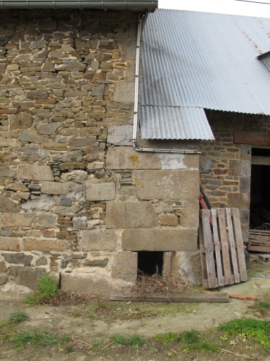 La lecture du premier cadastre de Noyal-sous-Bazouges en 1823, nous montre que l´écart de la Sainte-Bertière n´a pas beaucoup changé, si ce n´est par la construction récente de hangars agricoles et de bâtiments d´élevage. La ferme qui nous intéresse se situe au sud-ouest de cet écart et son plan est similaire à celui de 1823. La ferme est constituée d´un corps de logis entouré de deux dépendances plus récentes. Le corps de logis est représentatif des constructions de la fin du 16e siècle. Il reprend une typologie ancienne assez commune et toutes les caractéristiques de cette époque : forte pente de toit, pièce de vie au rez-de-chaussée et chambre à l´étage, porte en plein cintre, fenêtre à appui saillant et encadrements chanfreinés. La pente du toit est très forte, il est possible qu'elle ait été couverte en chaume autrefois. Les toits de chaume demandent en effet une pente de toit bien marquée afin que l'eau de pluie s'écoule correctement. Ce logis fait preuve d´un très bon niveau d´authenticité et regroupe les grandes caractéristiques de l´architecture rurale de la fin du 16e siècle et du début du 17e siècle. Les photographies prises en 1977 nous rappellent que la dépendance se trouvant à l´est du logis servait d´habitation. Depuis, des modifications ont été opérées sur la façade, avec l´agrandissement de la porte et de la fenêtre, de façon à former une porte cochère et en faire un bâtiment agricole. Au vu de l´appareillage régulier en façade et de l´usage du granite bleu au niveau des encadrements, il est probable que cette partie de la ferme, qui était encore couverte de chaume en 1977, ait été remaniée dans la deuxième moitié du 19e siècle. A l´ouest du logis se trouve une ancienne étable. Construite en granite, schiste et bauge, il semble que ce bâtiment ait été remanié avec des pierres de remploi. La date de 1926, portée sur une pierre de taille en granite au niveau de la porte, témoigne d'une période de travaux mais ne correspond pas à la date du bâtiment dans son ensemble, dont la construction, visible sur le cadastre de 1823, remonte plutôt au début du 19e siècle.