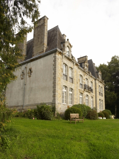 Bâtiment de plan régulier composé d'un corps central rectangulaire flanqué de deux ailes perpendiculaires en légère saillie sur les façades. Élévation en schiste avec granite en pierre de taille pour le soubassement, les chaînes d'angle, les encadrements de baies et les lucarnes. Les façades sont ordonnancées en travées régulières, trois sur le corps central, deux jumelées sur chaque pavillon ; la travée centrale, marqué par un balcon de ferronnerie au 1er étage, et les travées jumelées sont surmontées d'un fronton cintré interrompu par une lucarne. Les toitures sont à croupe, individualisée sur chaque corps, et couvertes d'ardoise. De hautes souches de cheminées sont disposées entre les corps de bâtiments. Les épis de faîtage et ornements de faîte en zinc, visibles sur la carte postale du début du 20e siècle, ont été enlevés avant 1977.