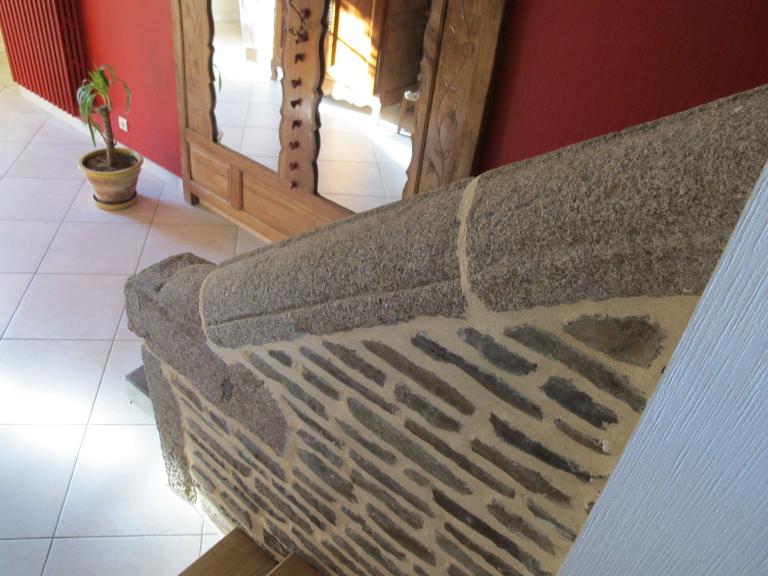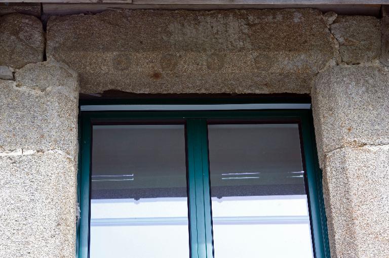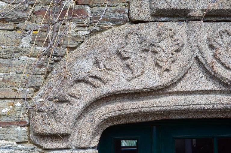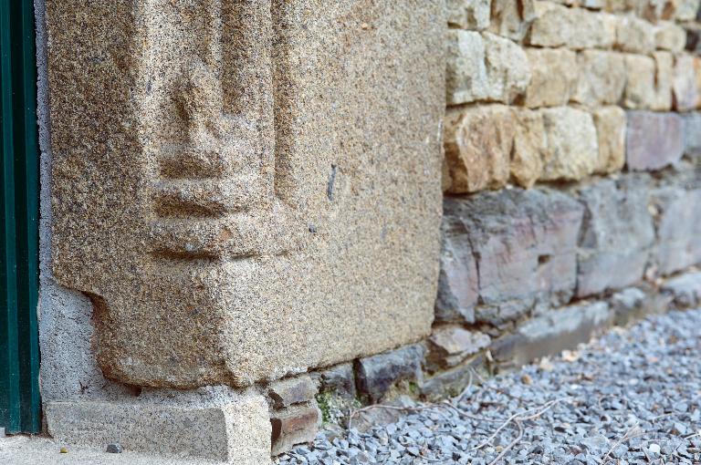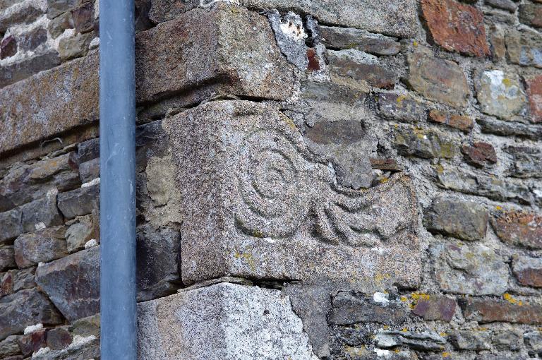 Le chaînage d'angle remploie des pierres sculptées présentant un décor de volutes.