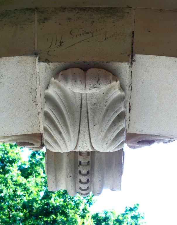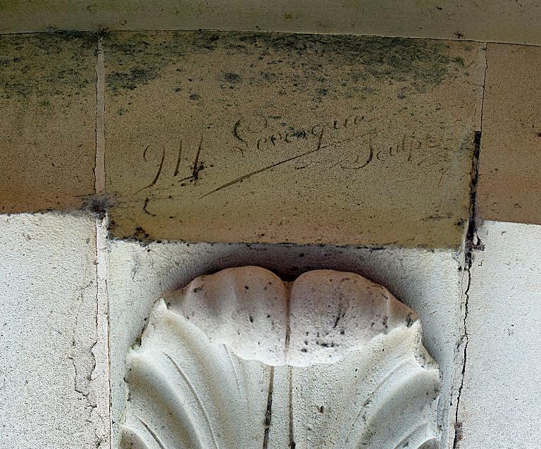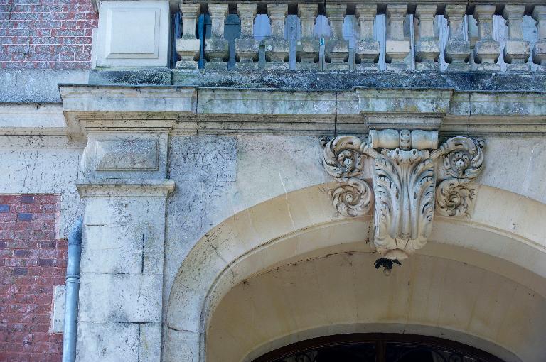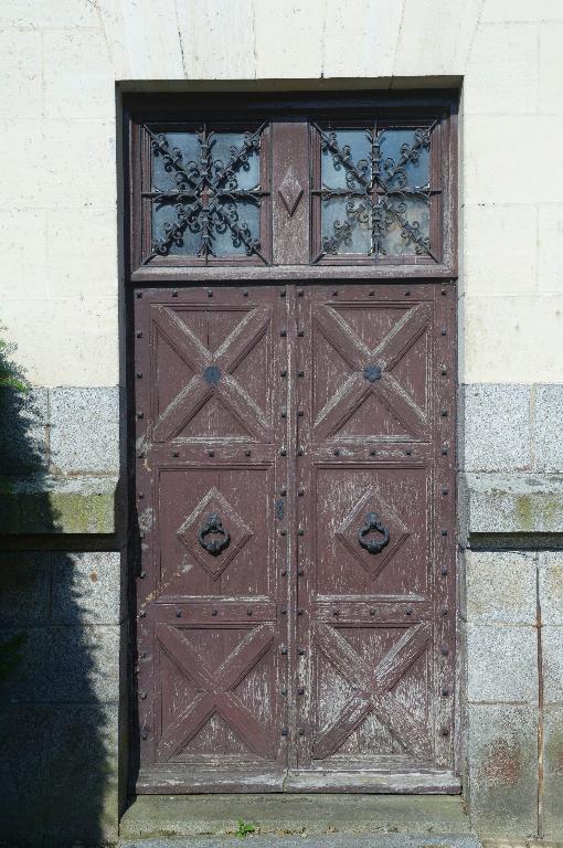Située au nord, l’entrée est précédée par un porche composé de piliers supportant un arc en anse de panier dont la clef est feuillagée. Une balustrade ferme le balcon aménagé au dessus de ce porche.