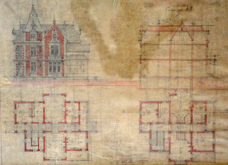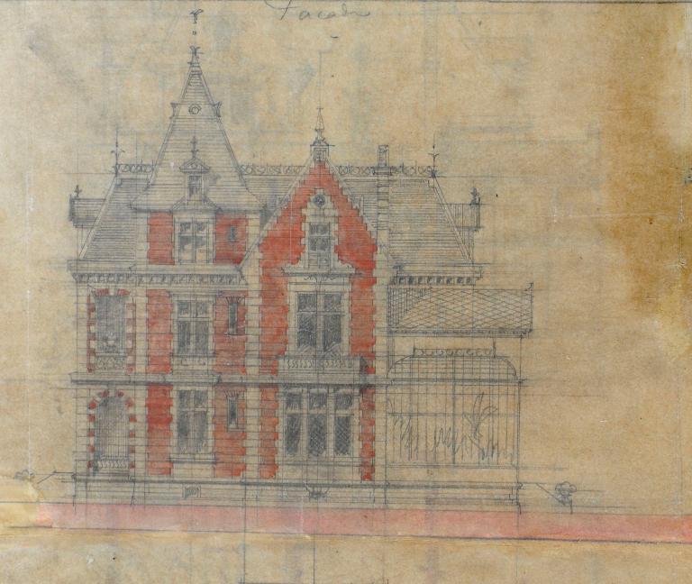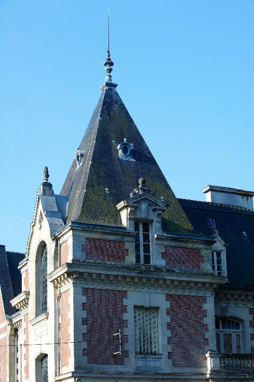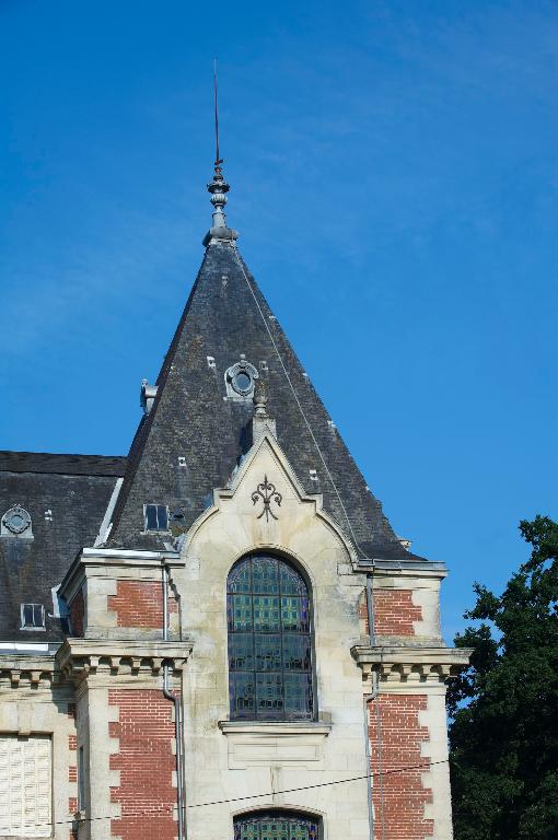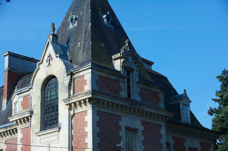 Soulignant particulièrement les lignes verticales et horizontales qui structurent l’ensemble, les effets de polychromie jouent un rôle essentiel dans l’animation des façades : les murs sont élevés en brique alors que le tuffeau a été réservé aux encadrements harpés des baies, des chaînages d’angles et des rampants des pignons. Ce parti pris décoratif explique la relative simplicité de forme des hautes baies du rez-de-chaussée et de l’étage. La variété du décor tient également au traitement en bossage des encadrements d’ouvertures comme aux reliefs plus marqués du bandeau et de la corniche à modillons (fortement saillante).