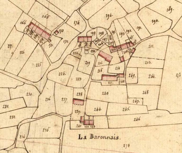 La ferme de la Baronnais est visible sur le cadastre napoléonien datant de 1824. On y voit un grand bâtiment exposé plein sud, flanqué sur sa partie est d’un bâtiment plus petit. Ces deux bâtiments sont encore existants. Cependant, tous les bâtiments annexes que l’on voit aujourd’hui, écurie, fournil, hangar agricole…, n’apparaissent pas sur le document ancien.