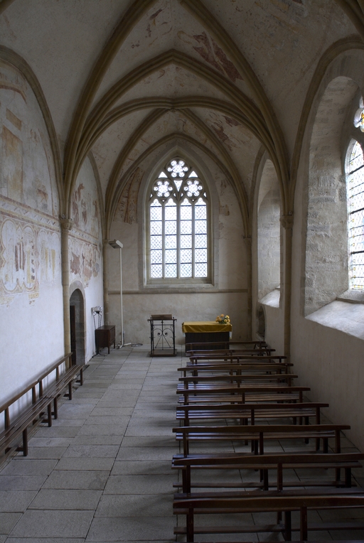 Lors de cette campagne de construction, les arcades sud de l'ancien chœur roman, qui devaient ouvrir sur un collatéral, ont été condamnées. Cet espace de 14 m sur 5 m désormais fermé a été voûté de trois travées d’ogives, et ses murs reçoivent, vers 1300, un décor de peintures murales illustrant la vie de saint Méen. Contrairement à l'opinion avancée par plusieurs auteurs, cette pièce n'a probablement jamais été une salle capitulaire : son emplacement, à l'opposé de l'ancien cloître au nord, infirme radicalement cette thèse hasardée sur une simple similitude d'aspect. Elle semble bien plutôt avoir été conçue dès l’origine pour renfermer l’important trésor de l’abbaye, qui abritait entre autres précieuses reliques les chefs et bras reliquaires de saint Méen et de saint Judicael, mentionnés dans une description de 1646. Son unique accès d'origine, par une petite porte dans le mur sud du chœur, ses voûtes d'ogives et ses fenêtres encore garnies de leurs grilles d'origine semblent appuyer l’hypothèse. Le style des peintures murales et la représentation dans une des scènes d'un carme au manteau rayé, abandonné par cet ordre au profit du manteau blanc à partir de 1287, situent ces peintures aux alentours de 1300. L'ouverture actuelle de cette pièce sur le bras sud du transept après démolition du refend qui l'en séparait résulte de sa transformation au XVIIe siècle en chapelle dédiée à saint Vincent Ferrier, puis de nouveau en sacristie au XIXe siècle.