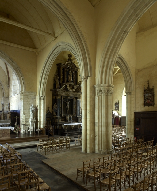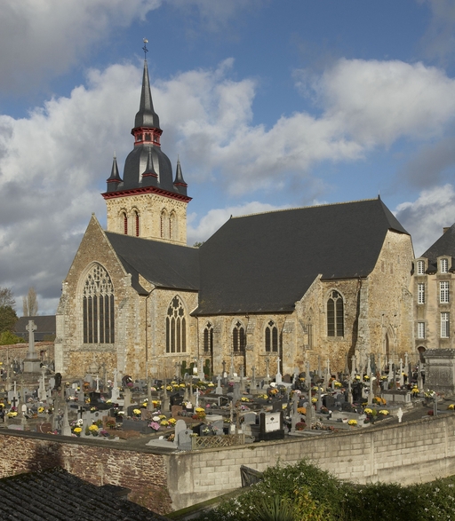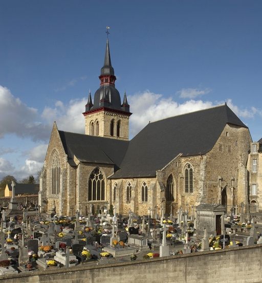 Le vaste transept, long de 35,50 m dans-œuvre, présente une disposition originale à chapelles orientées peu profondes, de plan rectangulaire, qui rappelle les plans cisterciens, l'une au sud dédiée au Saint-Esprit et l'autre au nord à Notre-Dame de Bon Secours. Le carré de la croisée ne sert qu'à délimiter l'espace intérieur de l'édifice et, curieusement, l'arc triomphal marquant l'entrée du chœur s'interrompt bien avant le lambris de couvrement du chœur qui file de manière continue depuis le mur du chevet jusqu'à celui de la tour à l'ouest. Le vaste transept largement débordant et dont les bras sont presque aussi longs que le chœur est rigoureusement scandé sur toute sa longueur, du nord vers le sud, par une série de cinq arcades que recroise au milieu deux autres arcades d'est en ouest délimitant la croisée. Comme le montre bien le décalage important du raccord du transept avec la tour du côté nord, ce nouveau chœur est sensiblement plus large que l'ancien ; il n'est pas voûté mais couvert d'un lambris en berceau brisé. L'architecture très particulière de ce transept est scandée de demi-colonnes adossées à des massifs aux arêtes chanfreinées Curieusement et de façon plutôt inhabituelle, le rouleau externe des arcs puissamment moulurés retombe non sur une colonnette mais sur les extrémités des murs : ce détail qui confère à l’ordonnance une élégance austère rappelle l'église de l'abbaye de Beauport. A la croisée, l'absence de colonnettes dans l'angle rentrant des piles est naturellement liée ici à l'absence de voûtement. Cette transcription épurée des formules du gothique classique met l'accent sur la vigueur de la mouluration des arcs qui font alterner de larges tores et de profonds cavets. Les beaux chapiteaux à crochets parfaitement dessinés ainsi que les bases retrouvées lors de sondages archéologiques, malheureusement de nouveau enfouies depuis, qui ont révélé des galettes débordantes et des lignes de perles semblables à celles que l’on trouve dans le chœur de Saint-Sauveur de Redon, appartiennent pleinement au gothique classique et orientent vers une datation du dernier tiers du XIIIe siècle. Le réseau de l'importante et haute verrière qui s'ouvre généreusement dans le bras sud, bien au-delà de la base du pignon, est constitué de deux larges arcatures géminées dont les trois lancettes sommées d'arcs aigus se recroisent à leur sommet. Ces arcs recroisés, fréquents dans le milieu anglo-normand, que l'on retrouve sur les baies du collatéral nord du chœur, étaient également visible jusqu'au milieu du XIXe siècle dans une baie du mur ouest du bras sud, murée depuis. Dans la grande baie du bras sud, les formes ainsi déterminées sont remplies de rosaces à six ou cinq lobes, et le sommet occupé par une rose elle-même composée de sept petites roses à six lobes. Parmi les fragments de vitraux conservés, le rondel central au sommet de la baie présente un écu échiqueté d’or et d’azur à la bordure de gueules, brisé d'un franc quartier d’hermine, armes utilisées par les ducs de Bretagne depuis Pierre de Dreux, baillistre de Bretagne entre 1213 et 1237 et jusqu’en 1316, date à laquelle Jean III adopte l’écu d’hermine plein, date qui donne donc pour le transept un terminus ad quem. Il faut probablement attribuer cette campagne de construction à Jean II, duc de 1286 à1305, époux de Béatrice, fille du roi d'Angleterre Henri III.Le collatéral nord du chœur, que les actes anciens appellent “ chapelle de Saint-Florent et de Saint-Méen ” en souvenir du transfert des reliques de saint Méen à l'abbaye de Saint-Florent de Saumur au IXe siècle, double littéralement le chœur. De même hauteur que le vaisseau principal, par ses larges et hautes baies percées dans le mur nord et les larges arcades qui l'en séparent, il supplée au côté sud presque complètement aveugle. D'un style radicalement différent de celui du transept, ce collatéral nord a été reconstruit dans la première moitié du XIVe siècle. Les chapiteaux à feuillages souples et gonflés rappellent ceux du chœur de Dol et de Saint-Suliac. Les bases prismatiques à ressauts, les baies à lancettes aiguës qui se recoupent ont des accents anglo-saxons que l'on retrouve à la même époque à Notre-Dame de Lamballe. Le style tellement particulier de ces arcades, leurs bases à galette saillante sur une masse à pans coupés moulurée en talon, leurs chapiteaux à corbeille étirée que surmonte un tailloir à plusieurs ressauts pourraient sans difficulté passer pour l’œuvre d'un maître d'outre-Manche. Le tailloir qui touche la croisée, orné de serpents entrelacés rappelant de façon troublante les enluminures carolingiennes, fait sans doute aussi allusion à la légende de saint Méen auquel on attribuait d'avoir chassé des environs d'Angers un serpent monstrueux. Au fond, dans le mur du chevet, l'ancienne baie du collatéral, mise au jour lors de la récente restauration, présente un réseau anguleux à base de trilobes et de quadrilobes qui, avec les larges baies à dessin recroisé percées dans le mur nord, permettent de situer la reconstruction de cette partie de l'église au cours de la première moitié du XIVe siècle.